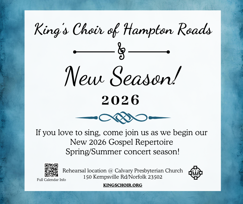 The King’s Choir is a vibrant, dynamic, community choir, which began in September of 2014, and became a non-profit choral organization in 2017. Currently, there are 125 active members representing 23 local churches, including other singers from the Hampton Roads area, and we are continuing to grow! Would you like to be a part of this wonderful choral group?—just inquire--it is our joy to welcome you!